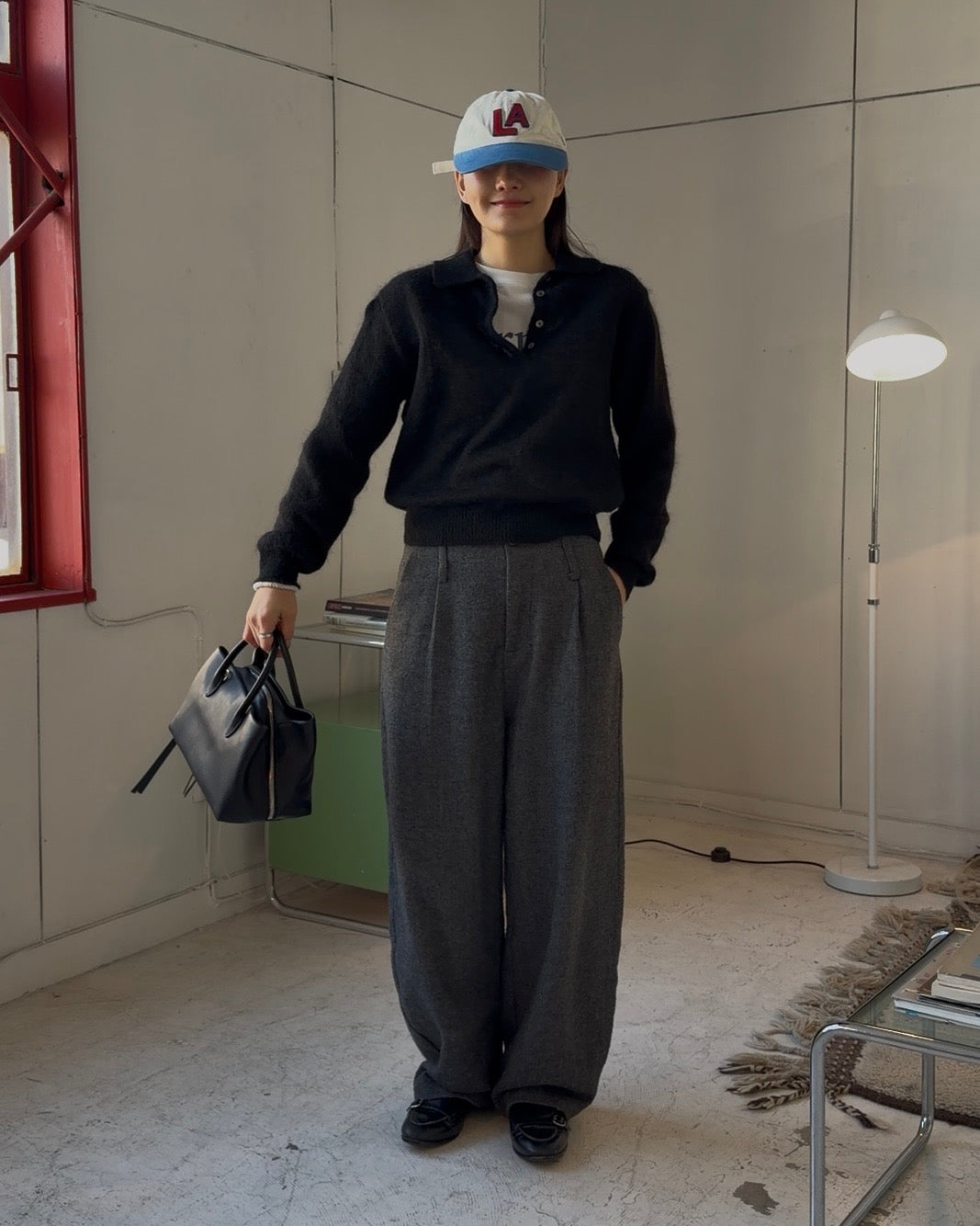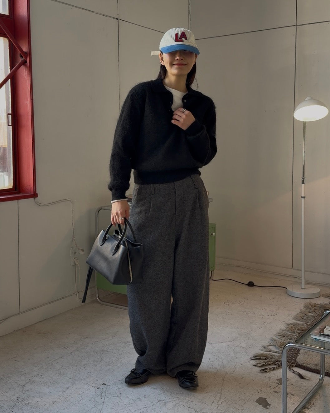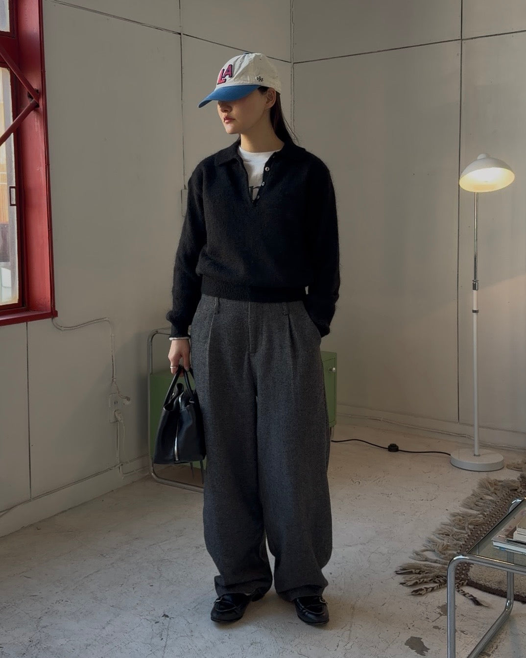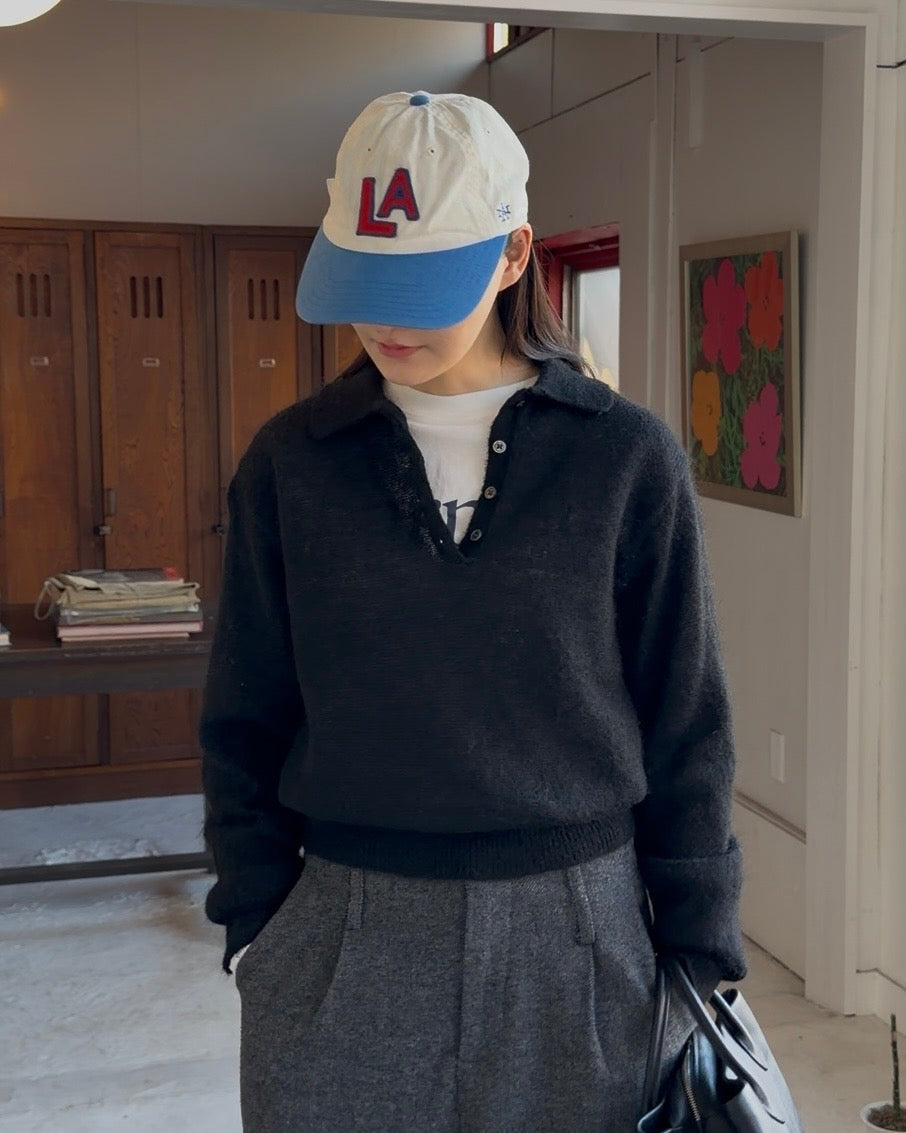 ナイロン40%・ウール31%・モヘア29%をブレンドした、軽さと温もりを併せ持つポロニット。モヘア特有のふんわりとした起毛感が表情に奥行きを与え、ウールの保温性とナイロンの安定感が、日常使いしやすいバランスをつくります。見た目以上に軽く、空気を含んだようなやさしい着心地が特徴。ポロ襟のデザインが程よくきちんと感を添え、ラフになりすぎない印象に仕上げています。