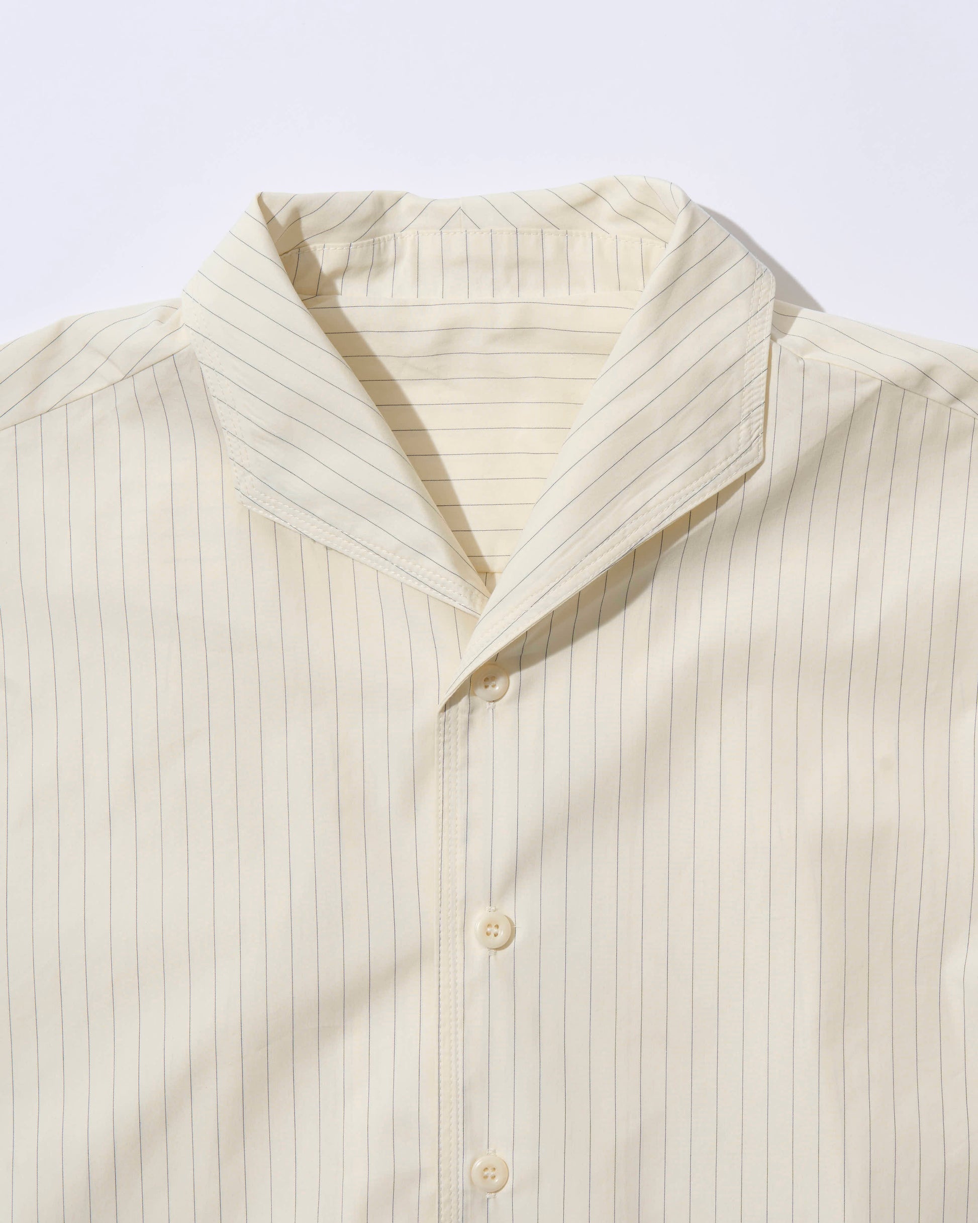 フロントのボタン配置や袖口のカフスはクラシックな仕様を踏襲しつつ、全体のバランスをすっきり整えることで、どんなスタイルにも合わせやすい汎用性を確保。タックインして端正にまとめるのはもちろん、羽織りとしてラフに重ねても、襟の立体感がスタイリングに奥行きを与えてくれます。ミニマルでありながら存在感のあるシルエットは、季節問わず活躍する一枚としてワードローブに加えたいアイテム。デニムやスラックスとの相性も良く、オンオフを自由に横断する万能なシャツです。