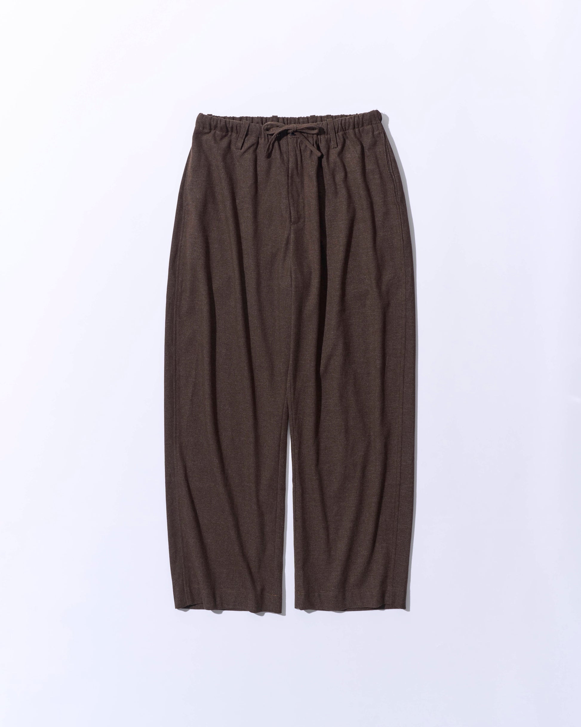 ややゆとりを持たせたストレートシルエットが、脚のラインを拾わず自然に体型をカバー。素材特有のしなやかなドレープが、動くたびに軽やかな印象を生みます。オンオフ問わず着回しやすく、シャツやカットソーをタックインしても、ゆるいスウェットを重ねてもバランスの取れる一本。シーズンレスで快適に穿ける万能なボトムスです。