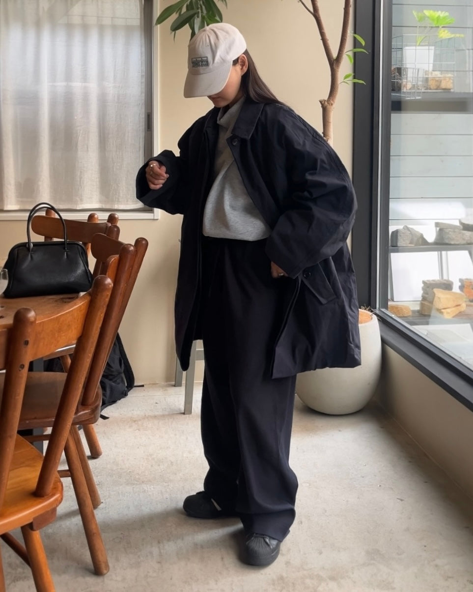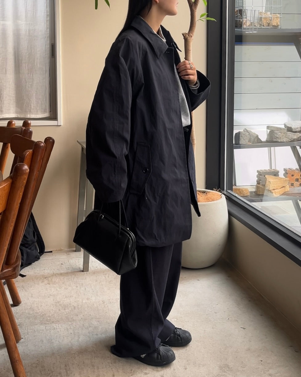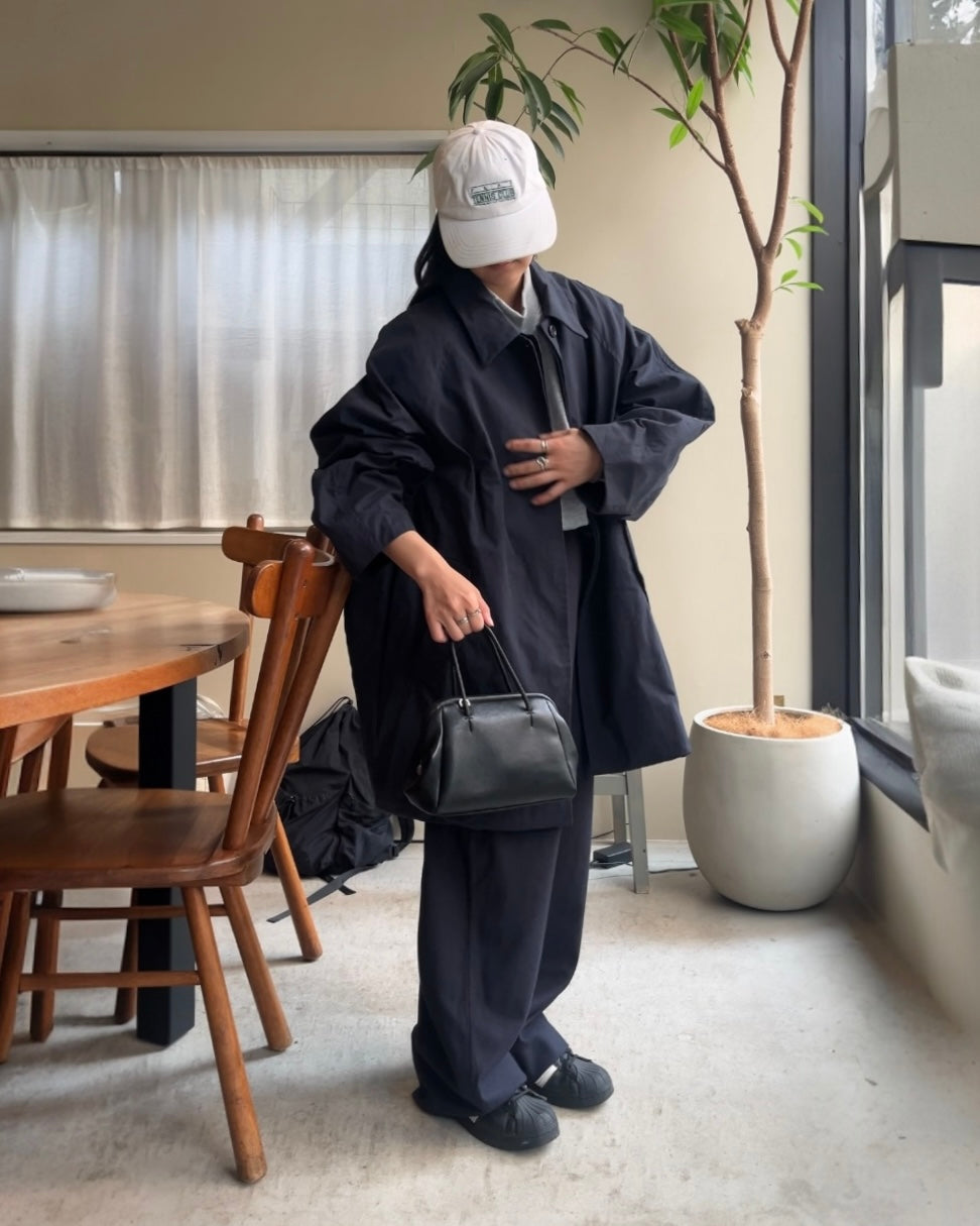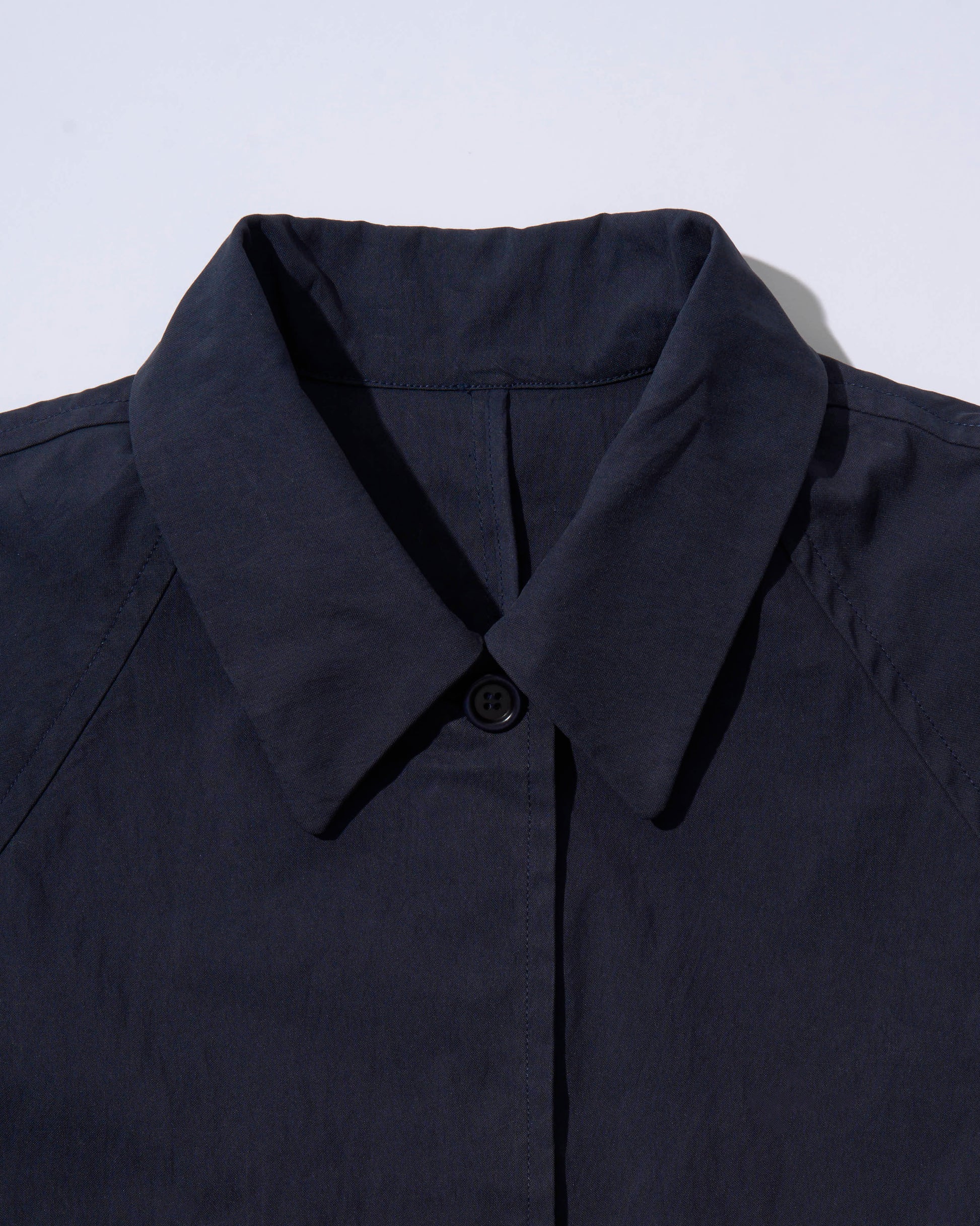 程よいハリと軽さを兼ね備えた、コットン65%・ナイロン35%の生地を使用したオーバーカラージャケット。ドライな質感とナチュラルな光沢感があり、季節を問わず快適に着用いただけます。ゆとりのあるボクシーシルエットに大きめの襟を組み合わせることで、シンプルながら存在感のある仕上がりになっています。